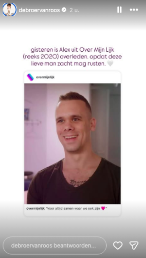 ‘Gisteren is Alex uit Over Mijn Lijk overleden. Opdat deze lieve man zacht mag rusten’, schrijft hij in zijn Instagram Stories.
