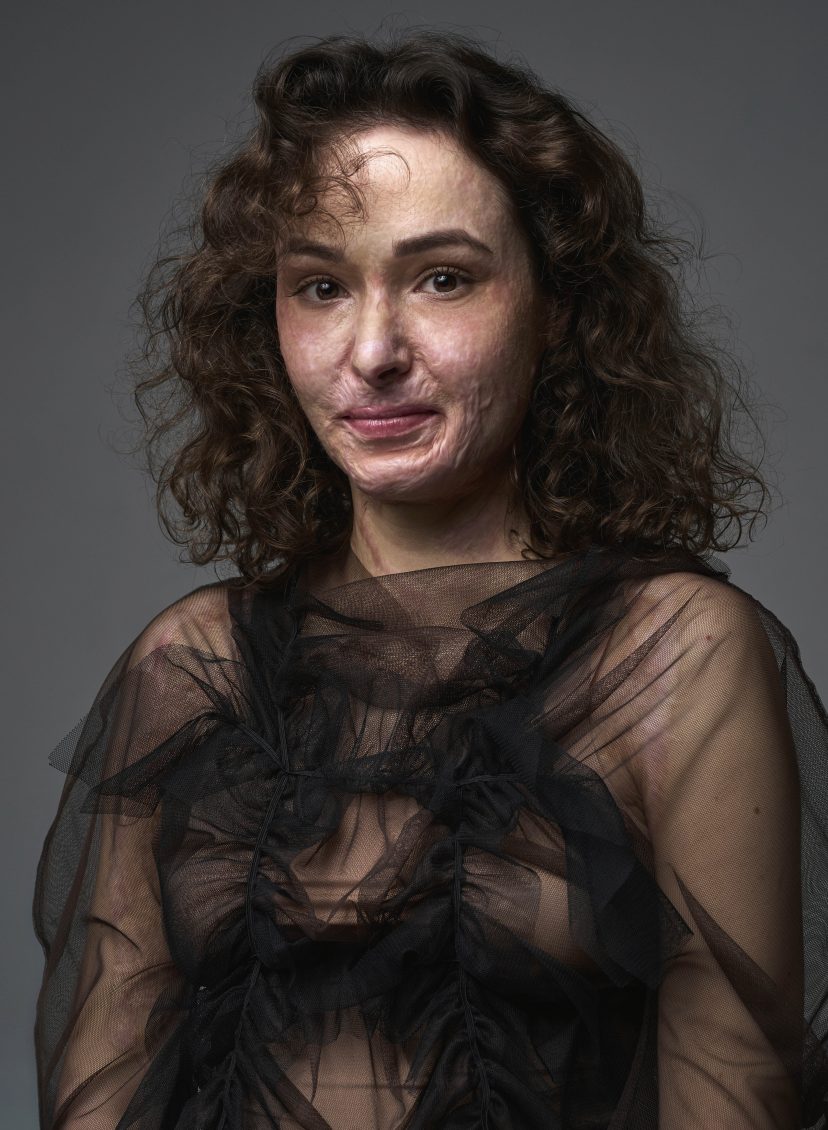 “In 2022 ben ik gevlucht uit Oekraïne. Vaak denken mensen dat ik mijn brandwonden in de oorlog opliep, maar het gebeurde toen ik net in Nederland woonde. Tijdens het eten stond er zo’n minihaardje met ethanol-gel op tafel en uit het niets was er een steekvlam die mij in brand zette. Mijn armen, gezicht, schouders, oksels en ook mijn haar vatten vlam. Ik heb vijf levensreddende operaties gehad met huidtransplantaties. Daarna volgden nog drie plastisch-chirurgische ingrepen, om mijn nek beweegbaarder maken en mijn mond beter te kunnen openen.
