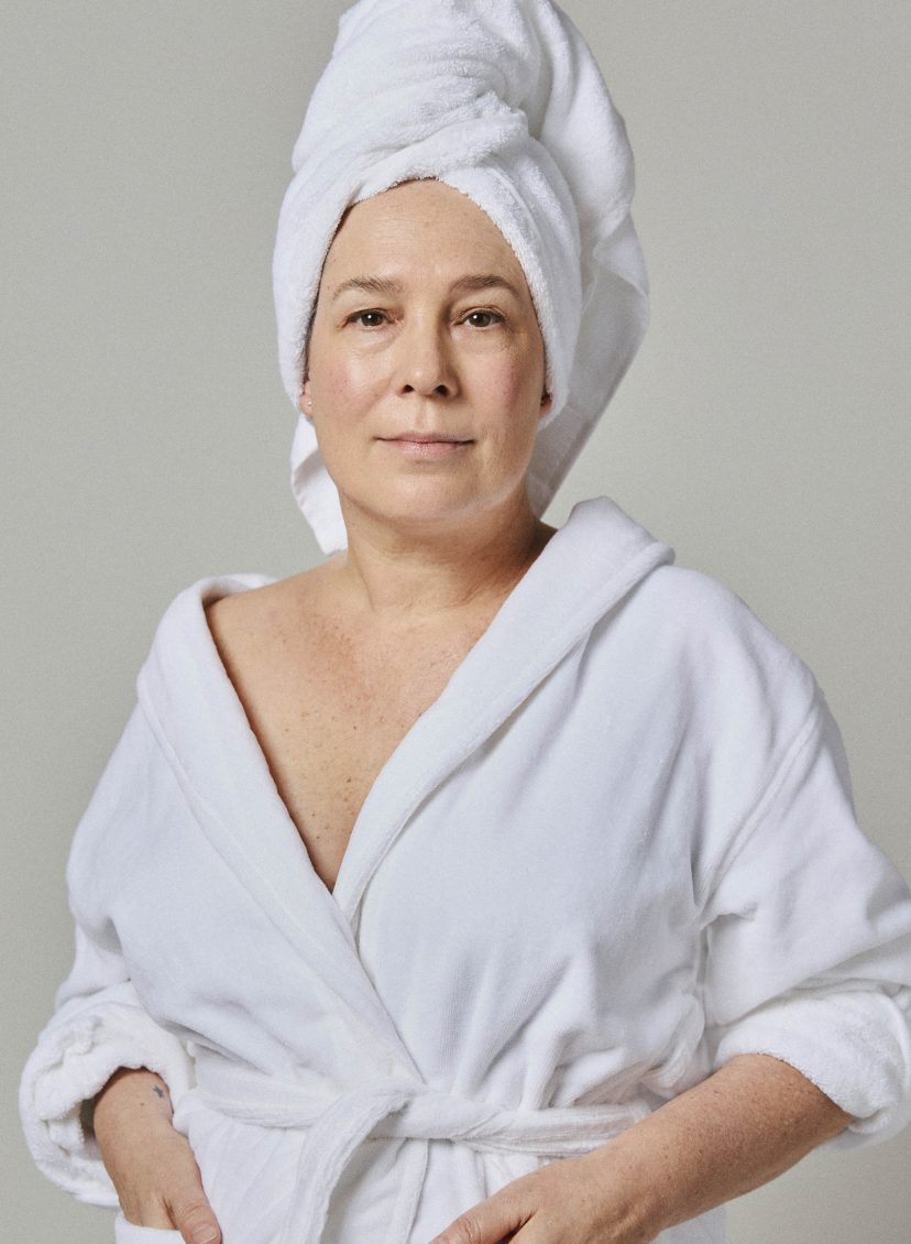 “Zolang het licht gunstig is en niemand vraagt om mijn ID, zeg ik dat ik 28 ben. Voor mijn dagelijkse ritueel gebruik ik dertig producten. Het begint onder de douche: face wash, scrub, daarna serums voor gezicht, hals en decolleté. Alles waar de zwaartekracht vat op heeft, krijgt aandacht en omdat mijn borsten aan een neerwaartse carrière zijn begonnen, heb ik ook daar een speciale crème voor. Ik zweer bij een boosting gel. Dan door naar dagcrème, oogcrème, handcrème, nagelriemcrème – ik smeer alles in en geniet ondertussen van de me-time. ’s Avonds maak ik me klaar voor de nacht met net zo’n serie producten, want stel je voor dat één rimpel denkt dat ik even niet oplet.