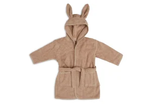 Deze baby badjas in zachte aardetinten is niet alleen schattig door de oortjes op de capuchon, maar ook praktisch dankzij het handige drukknoopje waarmee hij netjes dicht blijft zitten.