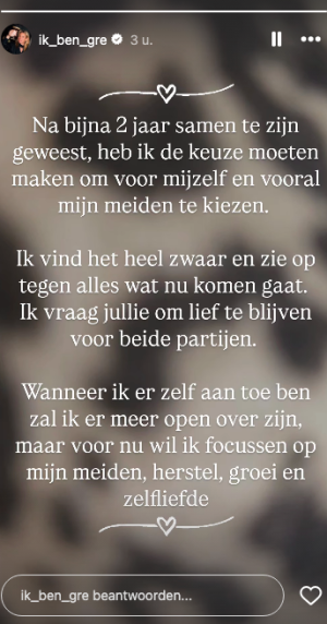 De reden is niet bekend, maar Greetje deelt via social media dat ze verdrietig is door de breuk. ‘Na bijna twee jaar samen te zijn geweest, heb ik de keuze moeten maken om voor mijzelf en vooral mijn meiden te kiezen’, schrijft ze op haar Instagram Stories.