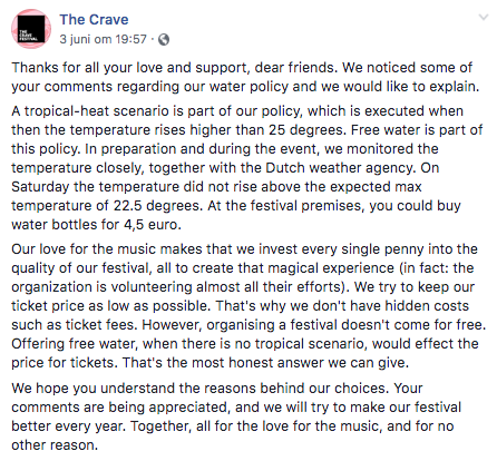 Met de zomerse temperaturen van afgelopen weekend was een flesje water bepaald geen luxe. Maar daar dacht de organisatie van dancefestival The Crave in Den Haag anders over.