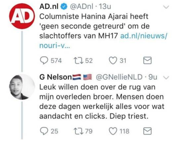 Nieuwsuur kreeg argwaan en spoorde de leugenaar afgelopen zomer op, waarna inderdaad bleek dat zijn broer nog springlevend is. Nelson ontkende dat het zijn account was, en zei slachtoffer te zijn van identiteitsfraude. Toch deed hij geen aangifte en ondernam hij geen actie tegen Twitter: hier klopte al iets niet.