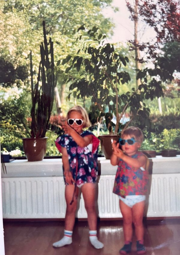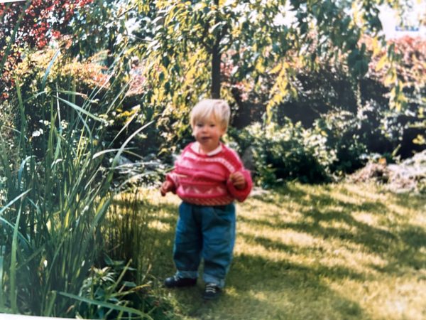 “Hier zie je mij in de voortuin van mijn ouderlijk huis. Ik denk dat ik een jaar of twee was en nog niet zo lang kon lopen. Mijn moeder heeft deze trui gebreid en was daar heel trots op; lekker in zo’n uitgesproken kleur. Ik vind het een schattig setje, echt een eind-jaren-tachtigoutfit. Ik werd vaak kleurrijk gekleed. Overigens heb ik nooit jurkjes gedragen. En ik moet je zeggen dat ik het daarna ook nooit heb gedaan. Ik kan geen een foto vinden van mezelf waarop ik een jurk draag.”