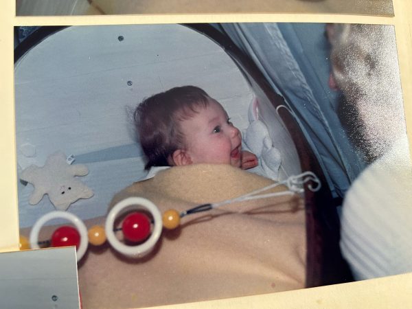 “Boven mij zie je mijn oma, de moeder van mijn moeder. Ze was ontzettend trots op mij. Helaas heb ik haar niet lang gekend, omdat ze overleed toen ik nog jong was. Daarom is dit een dierbare foto voor mij. De wieg waar ik in lig, is gemaakt door mijn opa van een opengezaagde wijnton. Mijn moeder heeft die altijd bewaard. We hebben nog overwogen om hem opnieuw te gebruiken, maar hij is inmiddels te oud en zit vol splinters. Toch is de wieg er nog steeds — mijn zusjes en ik hebben er alle drie in gelegen.”