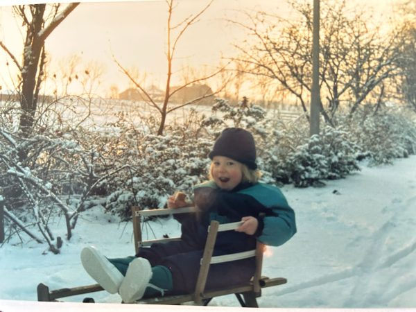 “Hier zit ik op een houten slee in de sneeuw. Voor mijn gevoel lag er toen in Nederland elke winter sneeuw. Maar dat was natuurlijk niet zo. Deze foto is ergens eind jaren tachtig genomen. In de winter gingen we vaak wandelen en soms zelfs met de slee naar school. Dat was heel typisch en kenmerkend voor die tijd.”