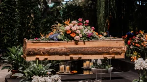 Vincent leefde voor de natuur en zijn grote droom was ooit boswachter te worden. Dat moest terugkomen in zijn afscheid. Van de magische locatie voor de dienst, met prachtig licht en een weelderig jungle-achtig decor, tot troostkaartjes met een geluksveertje en dus ook een passende kist. Als de laatste persoon langs het graf is gelopen, neem ik de papa’s mee naar de entree en is het wachten.