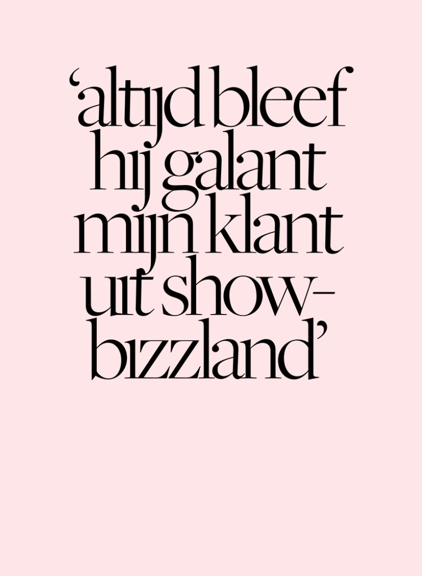 Hij bleef me bellen. Hij bleef hoffelijk. En hij bleef al die keren kijken hoe ik plaste. Het werd geen ding. Ik voelde me vrij. Gewaardeerd. Het was geen moeite voor me. Hij stond in de deuropening. Ontspannen. Respectvol. We dronken nog wat, kletsten over koetjes en kalfjes en op warme dagen haalde hij cornetto’s voor me in huis. Ik zag hem afvallen. Opnieuw zwaarder worden. Altijd bleef hij galant. Mijn Heer Bommel uit Showbizzland.•