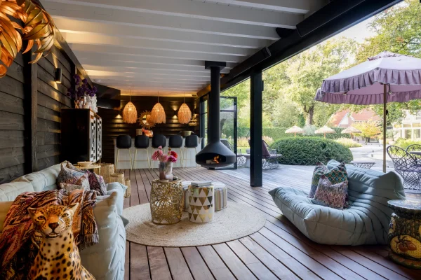 Nog meer zin om te ontspannen? Onder de overkapping vind je een loungeplek. Plof neer in een zitzak of op de bank met een cocktail in je hand, of schuif met vrienden aan bij de bar voor een borrel.