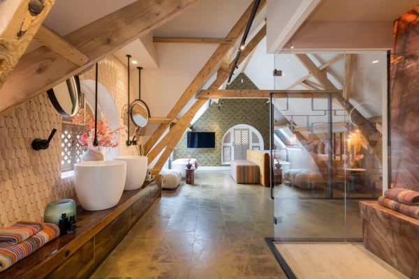 Ook in de badkamer zie je diezelfde stijl terug, bijvoorbeeld aan de houten balken en de muren met reliëfbehang. Hier vind je alle ruimte en luxe, perfect voor een volledige spadag. Je kunt er zelfs een film kijken terwijl je heerlijk in bad ligt.