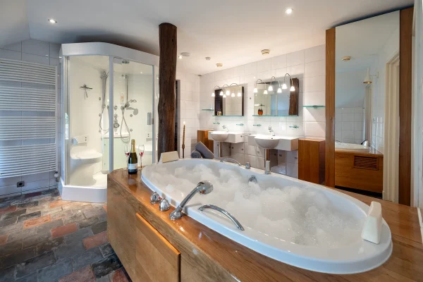 Zelfs in de badkamer zie je de houten elementen terug, bijvoorbeeld bij het bad, waar je lekker kunt ontspannen met een goed glas wijn. Maar er is ook nog een douche-stoomcabine, net alsof je je eigen privé-spa hebt.